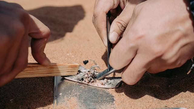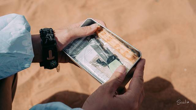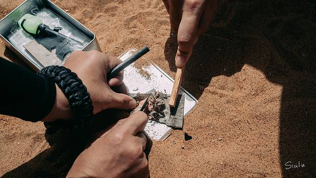 避免失温症是非常重要的生存技能,生火的材料就是盒子里这两块干燥的木材,一把野外生存刀和一块打火石,用这三样东西就能在荒漠中点燃属于自己的营火。