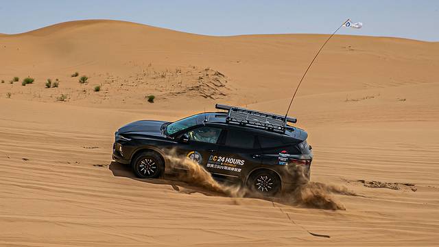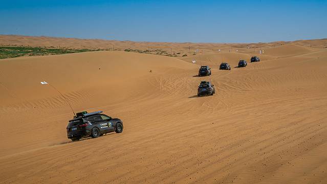 在沙丘间飙车,没点驾驶技术和处理陷车等意外的应急处理能力还是不行的,技术不够用车来凑,开拓者AWD智能四驱模式,着实帮了大忙,根据不同的路况调整不同的驾驶模式,让我们在免于陷车的同时,能感受到平稳高效的行驶。由于沙漠地形不平整,时高时低,坐起来感觉像过山车般刺激,为了更能适应越野挑战,在驾驶前统一换上了马牌的越野轮胎,这样一来大大提升了抓地力和耐磨性,车辆在松软的沙石路面也有很好的脱困能力。