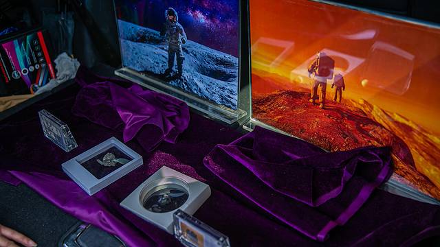 这两块是指导老师自己收藏的月球和火星的陨石。当有质量较大的天体撞击月球和火星的时候,在巨大的冲击力之下,岩石会飞溅入太空之中,某些具有巨大势能的岩石会脱离月球和火星的引力到太空中流浪。