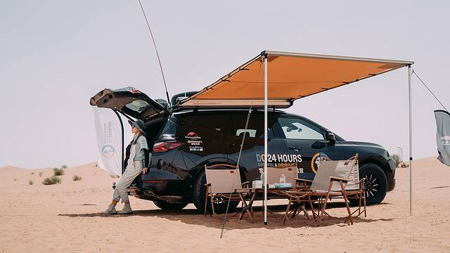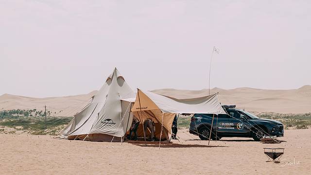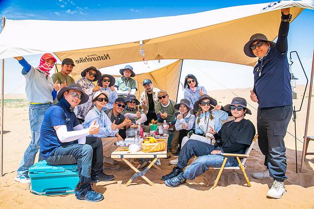 大约开了一小时左右终于到达驻扎点,大家伙都从车里拿出扎营的工具,各自开始忙碌了起来,从车顶行李架侧面拉出遮阳棚,一车四位小伙伴轻松组装完成,在棚下摆起挪客的桌椅,就能享受沙漠烈日下的一抹清凉了~