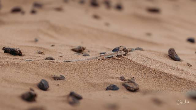 仔细看,就能发现在沙漠中隐匿着的小家伙们,沙蜥的体型较小,能够将自己藏在沙砾中,其实不光是沙蜥,其他很多动物都擅长如何在沙漠中隐藏自己。因此,这里需要提醒各位,在进行沙漠活动的过程中,一定要穿可以防蛇咬的鞋子,沙漠的毒蛇隐蔽程度极高,一旦没有做好措施,很可能就丧命“沙场”~