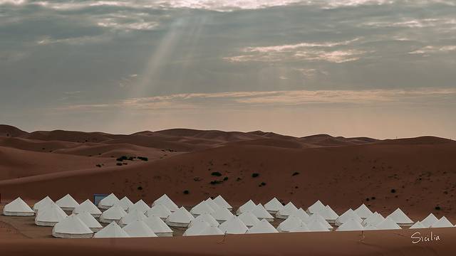 站在沙丘上,看远处清一色的白帐篷,头顶是云层缝隙映射下来的光束,这种感觉比站在沙滩边看大海更微妙,是照片和文字无法表达的。如果有机会,建议你们一定要来亲身体验一下。