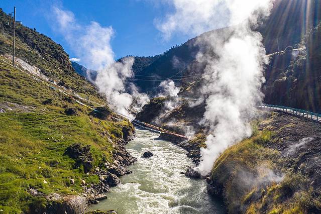 热坑温泉群的袅袅烟雾