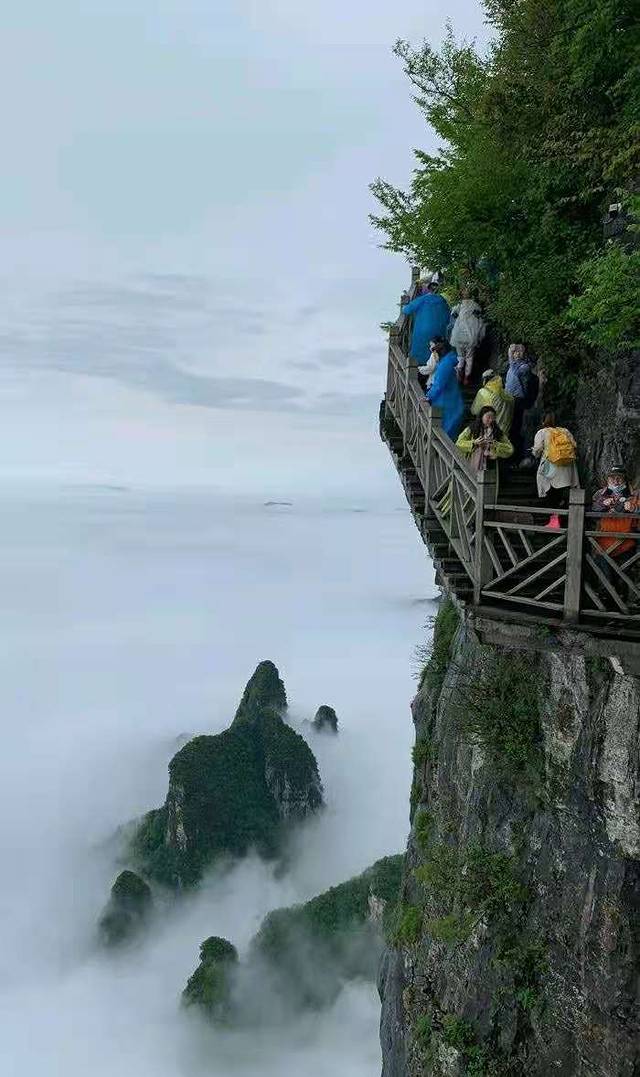 索道到达山顶后需要走的路并不多路程相对比较短但沿途风景巨佳(不用太急着赶路程好好欣赏)🟣天门山的台阶是999阶寓意吧个人觉得特别好这段路可以选择走也可以坐电梯根据体力选吧🔵如果遇上起大雾一定不要急着走‼️基本一阵风后就能看到完整天门山———————————————————————————本人正巧赶上了多雨的季节去坐索道上去一路上都是雾几乎看了个寂寞但到达山上后反倒因为雨后天气看到了云海总之不论什么天气这样的景特别值得一去🌧️强烈建议建议带好雨具以防下雨雨鞋套雨衣最好🍑宝提前买好景点附近买的质量一般般