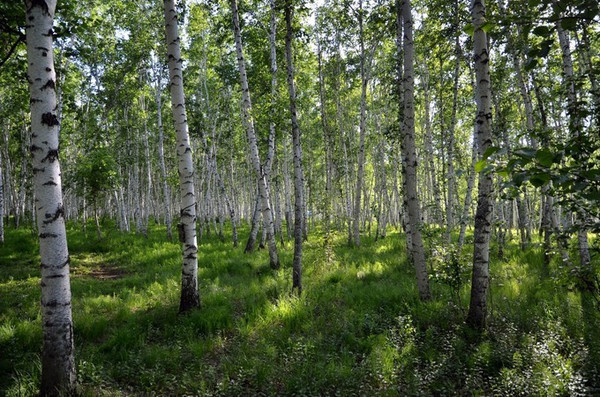 一片白桦林出现在路旁,我们走下车,走进林间,去享受白桦林的幽静。阳光从树梢 间隙射进来,照到林间的草地上,草地上斑驳陆离。我们徜徉在密密的白桦林中,那白色的树干上,总有那数不完的盯着你的眼睛,我独自在想:再过两个月,秋天到了,白桦树的叶子黄了,这里该是一个多么漂亮的地方!