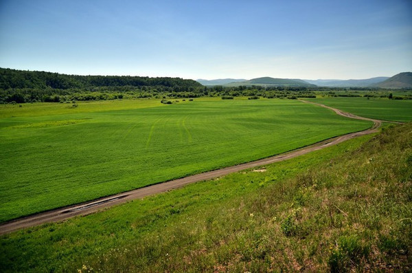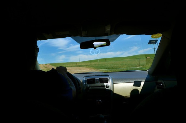 草原上的路不宽,路两旁就是草原,越往北走,草原上被开垦的土地越多。远边的天际挂着一朵朵白云,在一块黑油油的土地的那一侧,远远的,阳光飘洒在油菜花和草原上,黑的更暗,浅淡的更亮,这种图片后期处理的强烈的对比度,大自然在这里就这样给处理了。