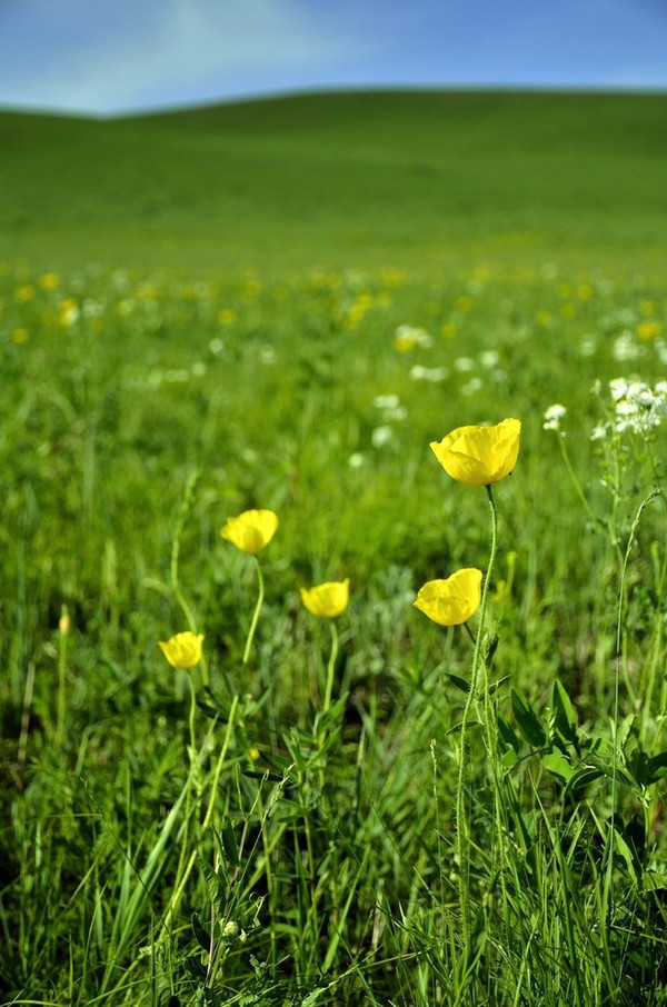 我们在雨后的草原上,趟着几乎没膝的草丛向附近的山头艰难的行进,草上的雨水打湿了裤腿,一路都是盛开的野花,红的、白的、蓝的、紫的,虽然叫不上来名字,色友们还是不断的停下身来,欣赏一番,拍摄下那靓丽的一瞬。
