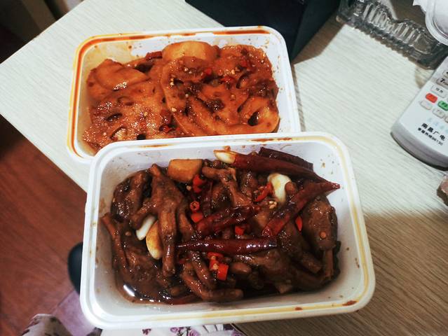 点了一个红烧鸡脚还有一个麻辣藕片,这个鸡脚非常软糯吃起来也非常的香,味道很不错,这个麻辣藕只有特辣,emmmmmm'=我是一个湖南人,这个特辣对于我来说好像也还可以接受。这两个菜一共是54块钱,平均下来就是27块钱。