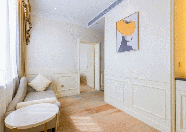 房间整体算是简欧风格,房间陈设很有格调,墙上挂着著名摄影作品。房间很多智能设备,开关灯,窗帘,电视都可以操作。瓶装水放置在走廊上,按需索取 都免费的。