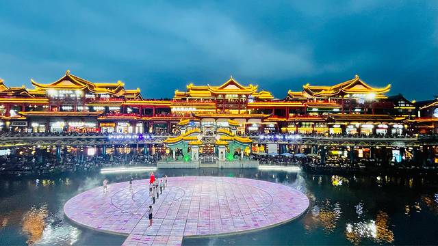 到了水街,我们先找了地方坐下喝了些东西。可能到的比较早水街没什么人,虽然是后建的但有点丽江古城的感觉,不过没那么大的规模。水街吃饭的地方很多,各样吃的都有。到了六点半之后人就非常多,原来是都在等晚上八点的表演~表演吧,我是不喜欢看的,就是唱歌跳舞那种,但是孩子很喜欢。如果不是坐在舞台旁边吃饭的饭店,就站在二楼看的也很清楚。