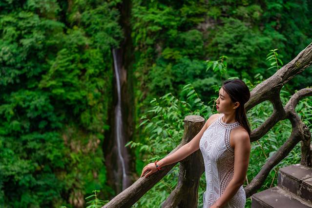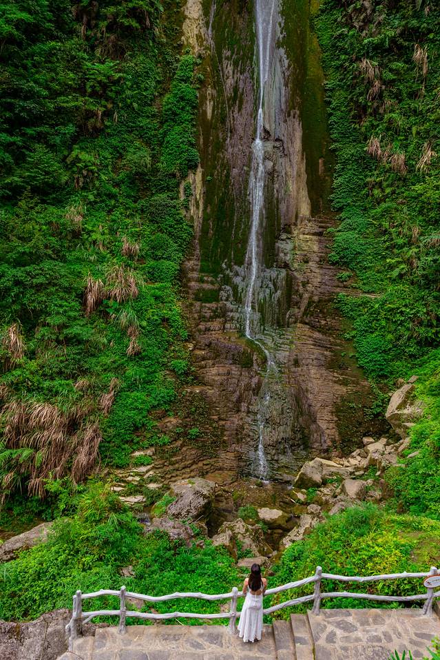 在天问台旁边有一条栈道,远处的玉带瀑布与我们隔空相对,偶有微风拂过,溅起的水珠随风舞动,似天宫上嫦娥仙子的衣带般光彩夺目。随着石梯往下就是德夯峡谷景区中的玉泉溪峡谷,我们下午要去的地方。