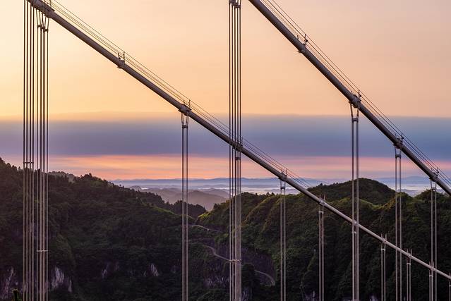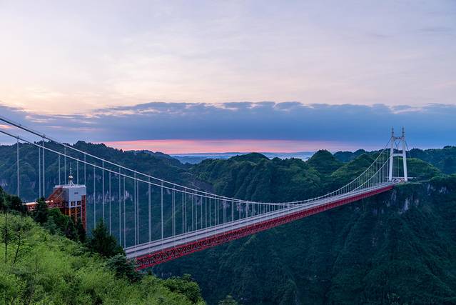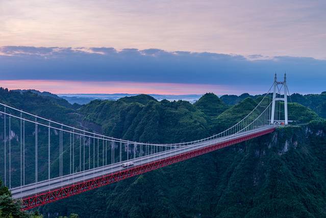 此桥地处云贵高原和沅麻盆地交界处,地势险要,桥梁建设中当时创下了四个“世界第一”:主跨峡谷悬索桥长度世界第一;世上首次采用塔、梁完全分离的结构设计方案;采用轨索滑移法,架设钢桁梁施工,世界首创;采用岩锚吊索结构和碳纤维为预应力筋材,世界首创。大写的赞!