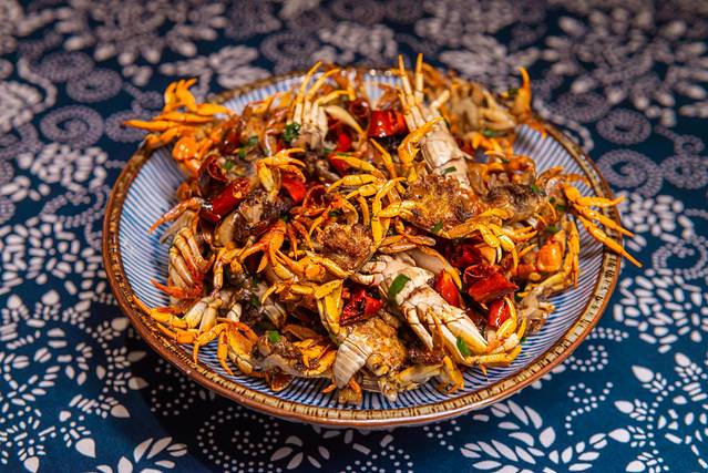 小溪流的石头下面有很多小螃蟹,一摸一个准,这一盘小螃蟹就是我们自己在小溪流里捉到的,自己捉的小螃蟹就是香!
