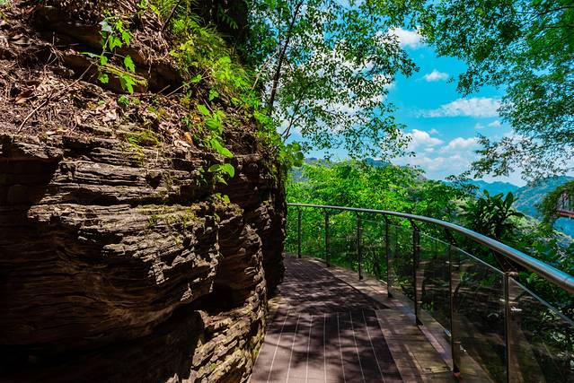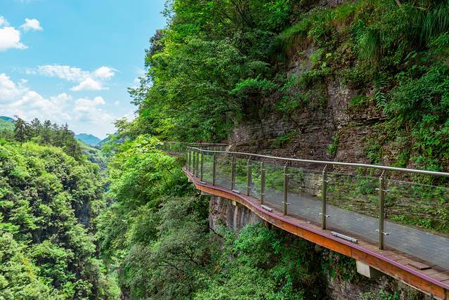 刚进入栈道时都是这种木质慢道,掩映在绿树丛中,看着远处一望无际的蓝天白云,感受着清风拂面而过的凉爽,闻着空气间散发着的草木气息,整个人都处于一种十分放松的状态,脑海则在想着,这栈道好温柔啊,一点儿都不吓人呢!