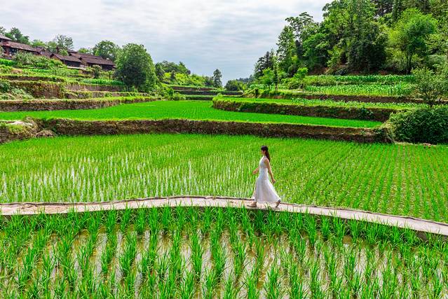 吉斗苗寨的特色之一就是梯田,稻田,这个季节还是绿油油的一片,据说稻田里还养着稻花鱼哟,看这稻子像不像韭菜,嘿嘿!