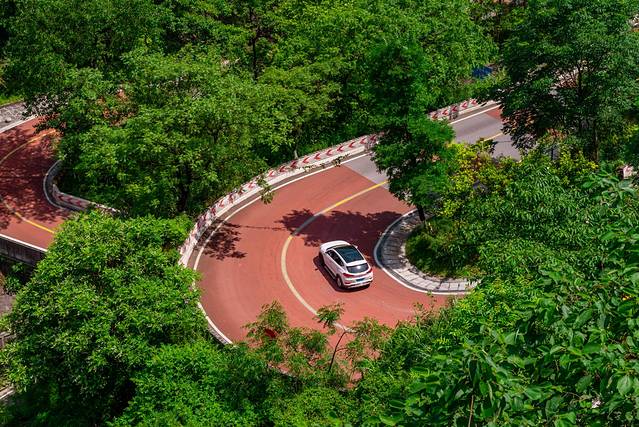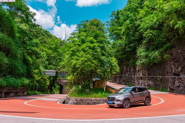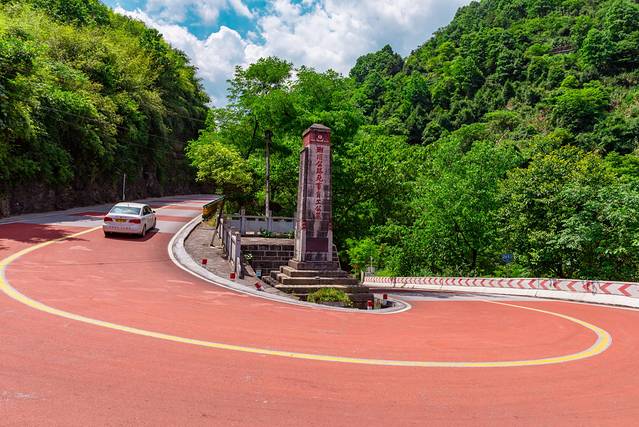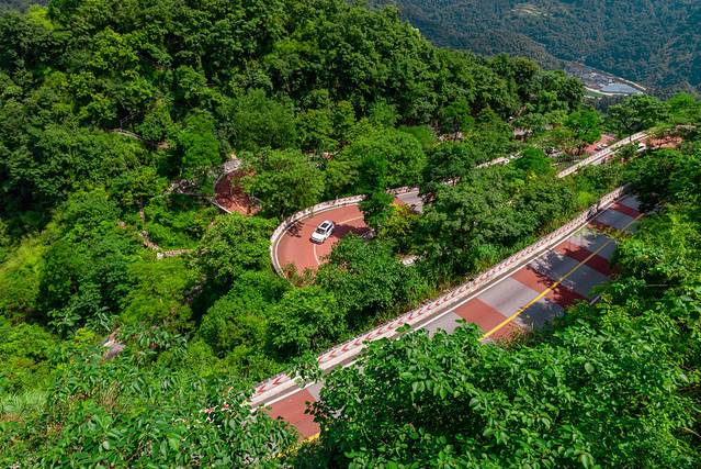 从山脚沿着蜿蜒的山路上山,路旁树木如盖,如今已不大能看出其路况之险。但是在当时,这条公路地势之险,设计之巧,居于全国公路之冠,可感震撼!