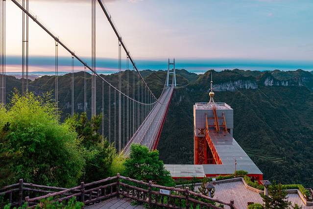左边大桥,右边是去大桥第二层观光通道的观光电梯,电梯采用贴山钢结构井架的方式修建,应用曲面玻璃透光,视野宽广,完整的将大桥、峡谷、村寨收入眼底,是一种不错的观光体验。