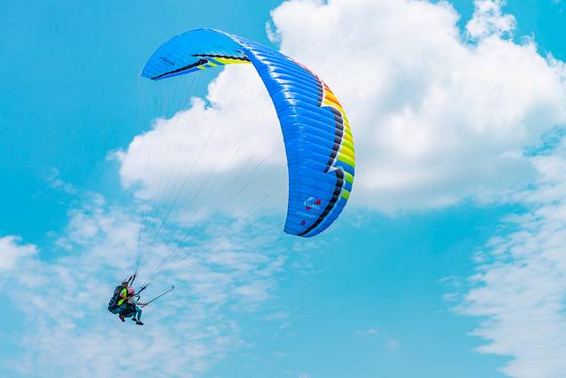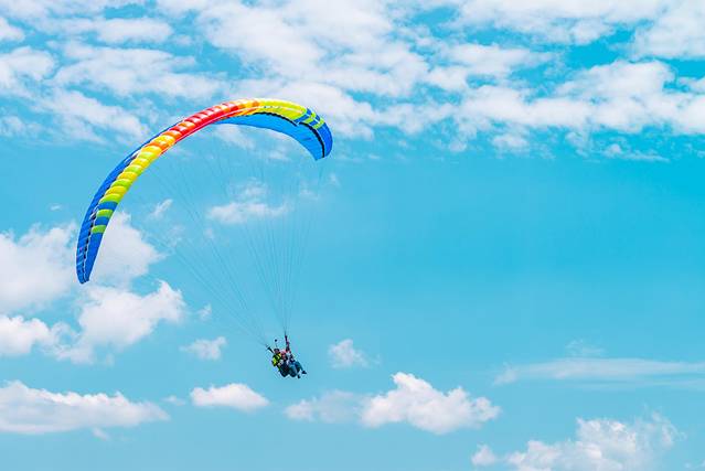 滑翔伞之所以能飞,除了伞衣充气后显示出的飞行翼,全靠飞行员的控制,结合空气气流飞行。
