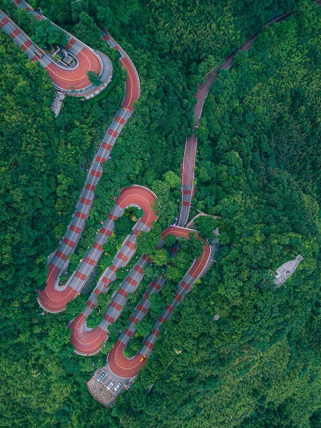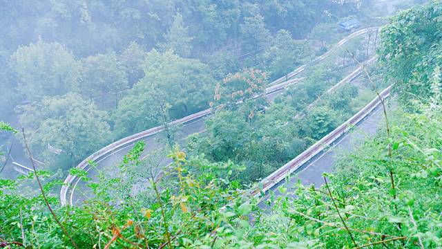 下山方向前行一两百米有个观景台,那里是个不错的云雾天气拍云海或者云雾缭绕场景的位置,还可以看到盘山公路弯道,很是漂亮!