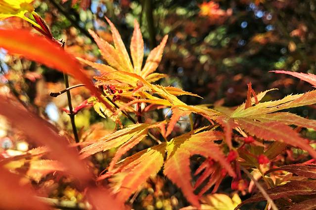 火红的枫叶在阳光的照耀下绚烂的耀眼,晨曦中,仿佛是小镇向我们伸出手掌,欢迎我们的到来,微风中带着和煦温暖。