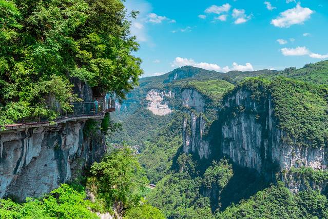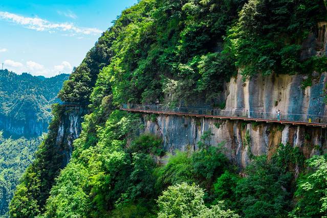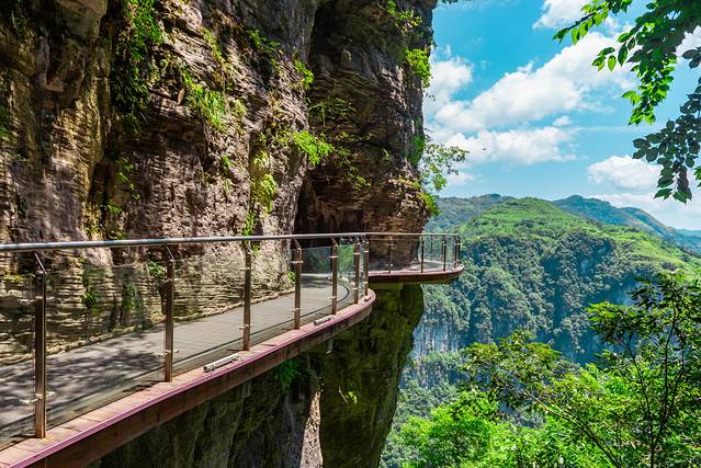 悬崖栈道位于矮寨奇观旅游区内,栈道与似刀劈斧削的峡谷悬崖垂直,与谷底落差300-400米,全长为1.6公里,其中包括玻璃栈道、崖顶观光平台和慢步行道。