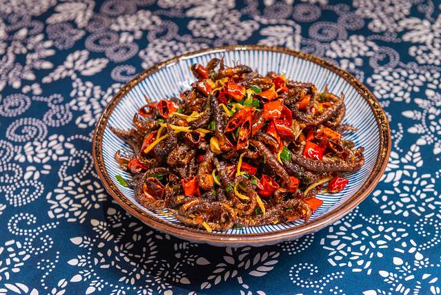 桃花虫是一种黑足小水虫,模样丑怪,生长在溪河中的石头下面或水溪中,只在每年桃花盛开的时候出现,捞上来的桃花虫经晒干,炒香后即可食用,味道非常鲜美。当地苗族人认为,“桃花虫”是大自然对他们的恩赐,桃花虫也是湘西著名的“小吃”。