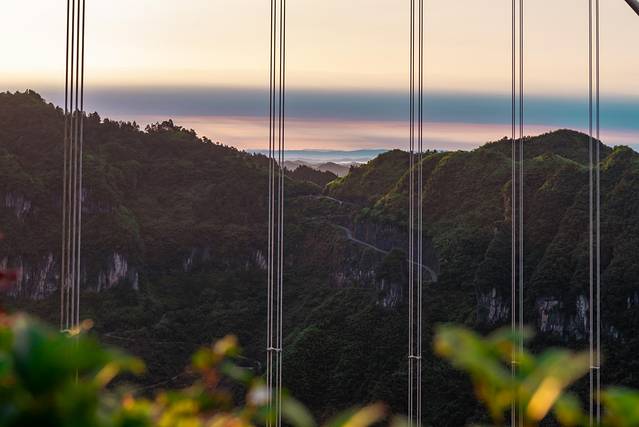 左边被拦住的就是去往天桥仙居的路,若是遇上好天气想拍日出,就可以走出来再往看到霞光的方向走点就可以啦,霞光中的桥似乎都没有那么冷硬,带着暖色柔和不少。