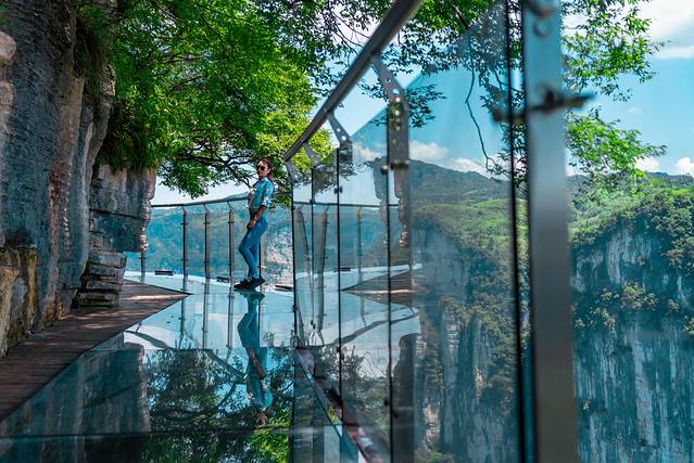 接下来就是玻璃栈道的那一段啦,也就一百米左右的长度体验,踩在透明的玻璃地面上,谷底的景致看得清清楚楚,脚下空落落的,颇有种空中漫步的感觉。