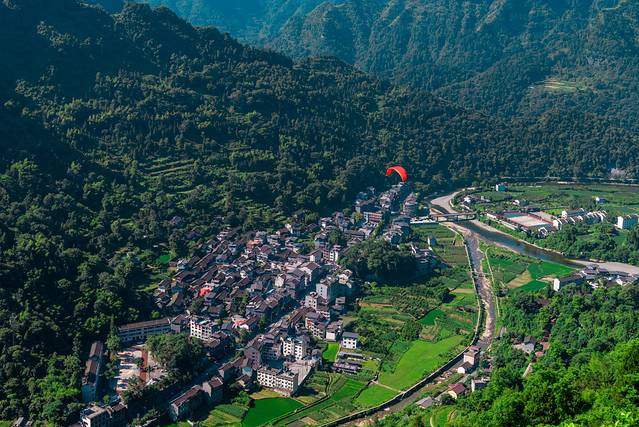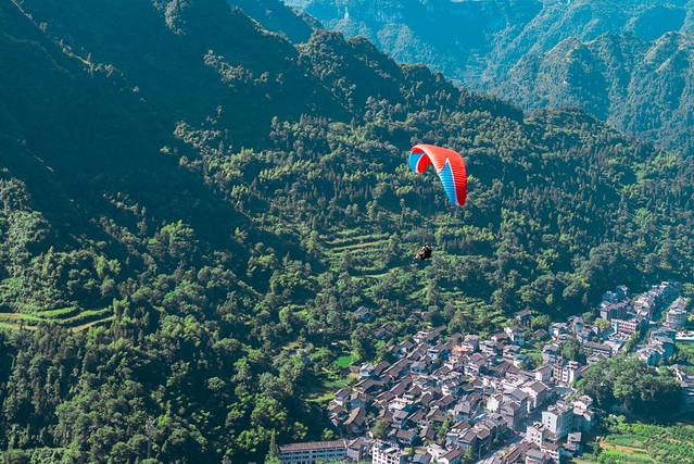 滑翔伞在空中飞行时间为十来分钟,很平稳,没有颠簸的感觉,降落的地方在山下的矮寨镇,现在山上可以看到有滑翔伞在别人家屋顶飞来飞去,然后降落在既定的空地上。