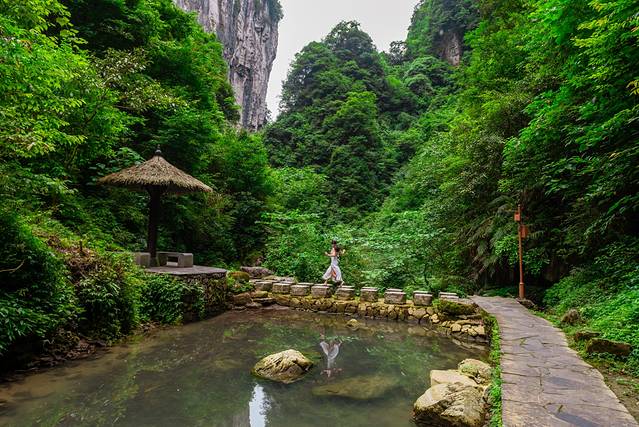 如果不想走下山这一截山路,也可以从吉斗苗寨出来以后坐车到德夯苗寨,然后乘坐电瓶车前往玉泉门方向,下了电瓶车之后徒步半小时左右吧,就可以到达玉泉门,这个水潭碧绿碧绿的,看起来很舒服,再往前就不用去啦。