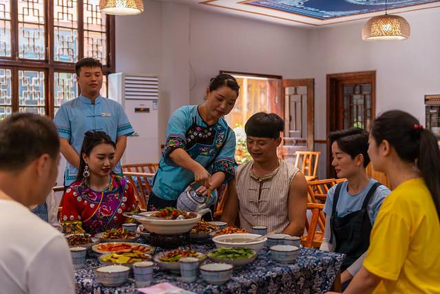这里是纯苗区,德夯苗寨将苗家热情好客的风俗习惯传承至今,我们在这里用午饭吃得是苗王宴,相当有仪式感。