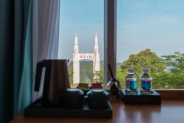 凯哥住的全景玻璃屋,超赞,躺在床上就可以看大桥,简直绝了。就是太阳晒着有些热,不过有空调问题不大,电动窗帘也是非常方便,按一下按钮自动开关,特别省心。
