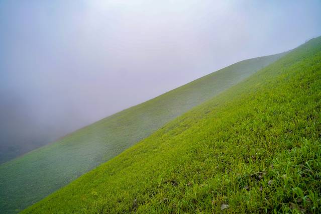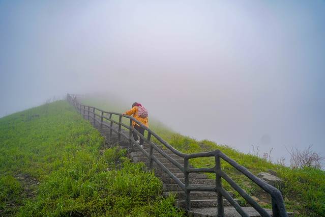 我们去的当天绵绵细雨还夹杂着阵阵风声,原本通往金顶的这条路就已经让很多人都感到疲惫不堪了,加上着恶劣的条件,徒步的路程又增添几分考验。随着雨水的不停拍打,山道上能见度越来越低,台阶也越来越陡,四十分钟后到达观景台。随着海拔的升高,不知不觉中身边的树林不见了,只剩下稀稀拉拉的一两颗孤零零的伫立,抬眼处已是满眼绿色的高山草甸。