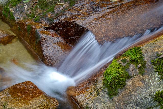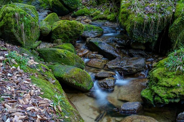 再往后走,沿途一路都水流不断,数不清的小瀑布与野蛮生长的绿树组成了这里的奇景。如若你够仔细,脚下的砖有时还能看到生长的菌类,而树枝上,岩石表面随处布满了青苔,水的边上树还长了许多分枝,那是环境极好的地方才会这样。