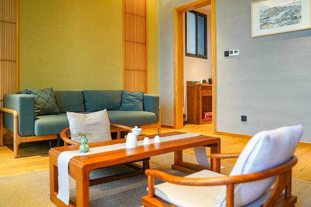 整座民宿,主打改良日式庭院和新中式的风格,将山野情趣融入其中。漫步在民宿里,可谓是一步一景,锦鲤池、红漆拱桥、竹林茶亭、枯木石墩,处处都透露着主人的精心设计。无论是公区,还是客房,处处都显现着这座民宿的高品质,定制的茶包、舒适的浴袍、客房外的棋盘·····