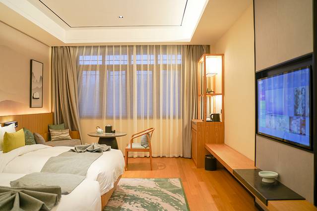 推开房门,进入房间,便有种城市按了后花园的感觉。房间设施与城市之中的星级酒店无异,窗外却是自然山色。