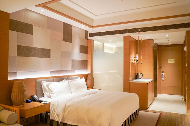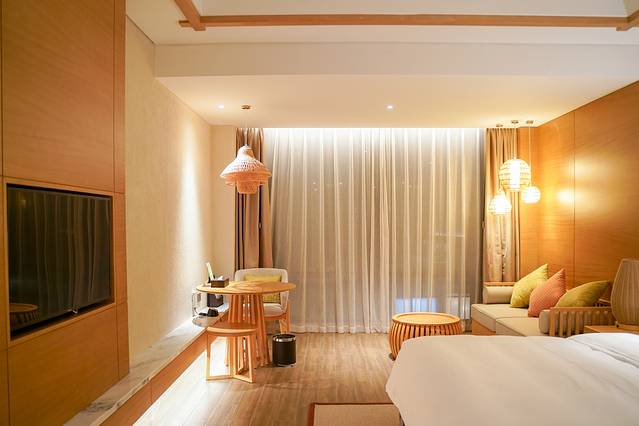 明月山假日酒店,作为度假城市的高端酒店,一改过往商务的风格,整个酒店,无论是这里的装饰装修还是配套设施都是非常温馨舒适,而我选择的大床房也是简单中不失高级感。