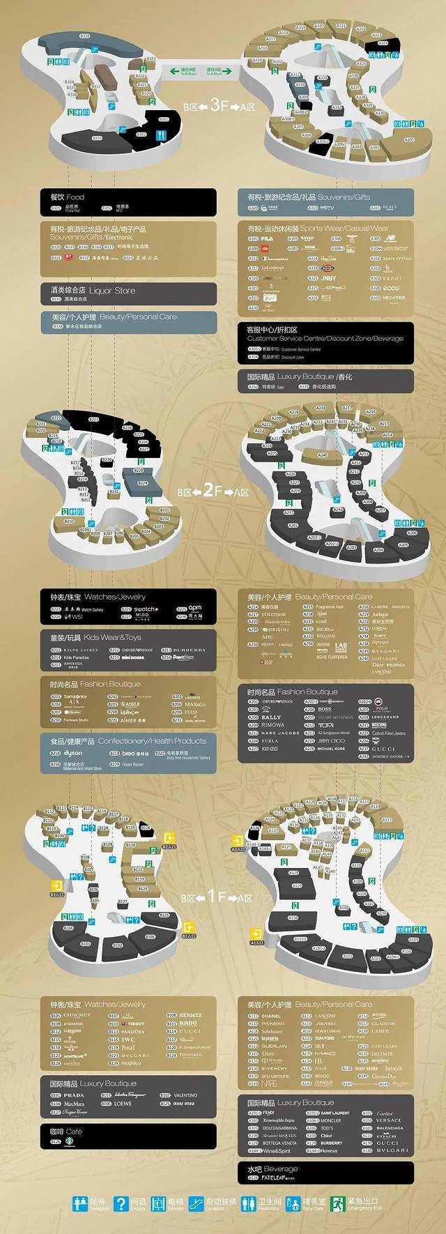 三亚国际免税城:从亚特兰蒂斯出来,六点左右,去“三亚国际免税城”购物,分为AB两个馆,共三层,免税城的楼层分布图奉上,基本上你需要的都能找到,找不到的再问问工作人员,这里的商品比正规渠道买会便宜200以上,但你要和某宝比,那就……