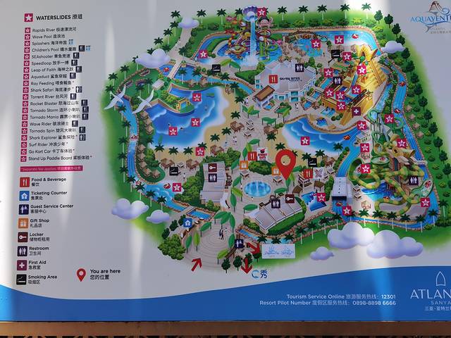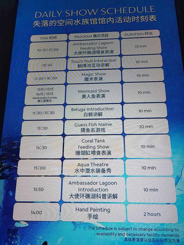 开放时间10:00—22:00,门票198,如果住在亚特兰蒂斯酒店,可以免费进入,下面贴上活动时刻表,供大家参考,不拍照纯游览半小时就出来了,拍照看表演1.5-2小时。