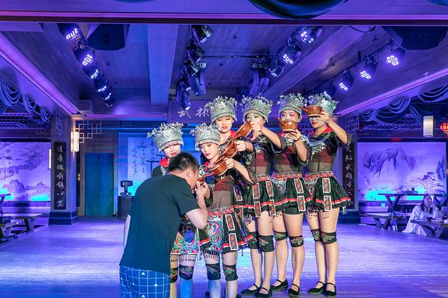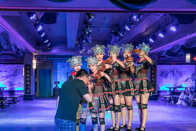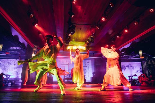 这不是歌舞表演,而是空间境遇剧,食客即是剧中人。古墓、峨眉、摩尼、丐帮、武当、五毒各掌门在亮相之前,台上的剑客们先打了一圈。