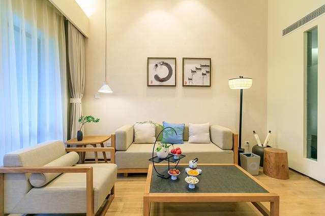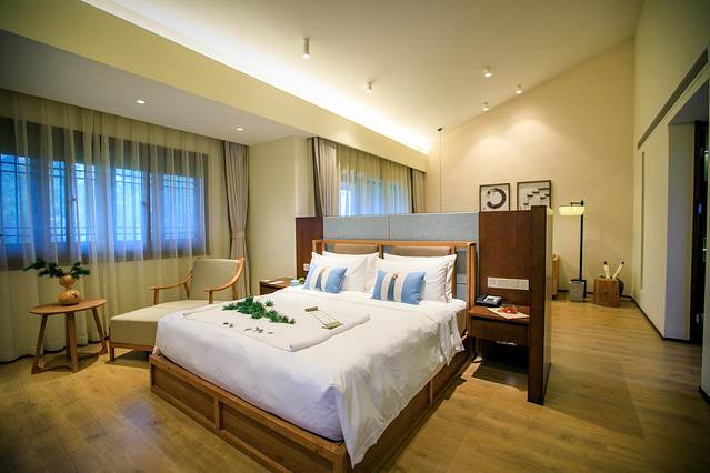 清新蓝调的配饰加上简洁设计的木质桌椅窗户,古朴而不失典雅。推窗远眺,山镇美景尽在眼前。