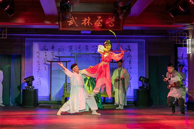 少林棍、流星锤、玉女剑、霸王刀,黄蓉郭靖也来捧场,上演弯弓射大雕。