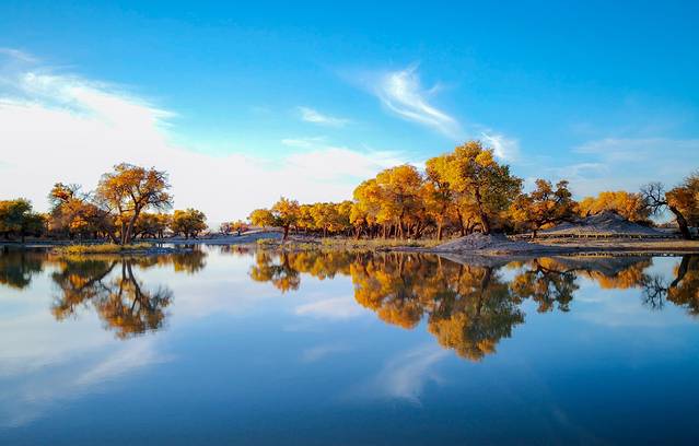 一大早我们来到大漠胡杨林景区,邂逅胡杨,寻一场三千年的守望。水镜胡杨是我最喜欢的景点,胡杨都倒映在水中,好像一幅双面画,美轮美奂。还有有天空之境之称的陶丽淖尔湖、芨芨草,土尔扈特部落、自驾车营地都很好看,在景区逛上一整天都不会嫌累,因为到一个景点会给你带来不同的惊喜。