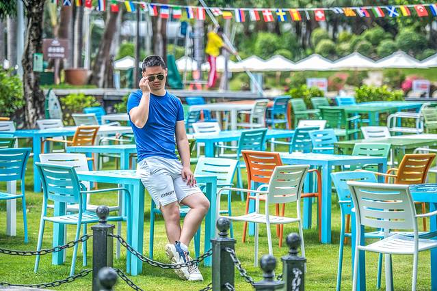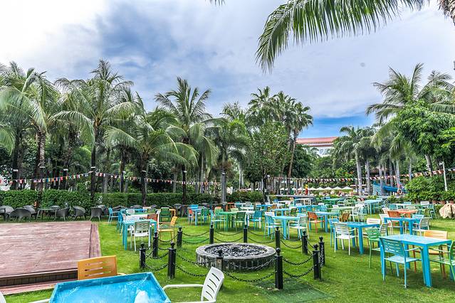 蜈支洲岛珊瑚酒店占地面积不小,公共区域很大,有很多休憩的地方,山野君随处找一个地方喝下午茶或是海鲜晚宴,这种露天式的就餐环境真的太赞了。趁着人少的时候,山野君预先到此打卡拍照。