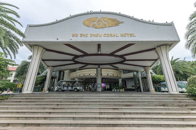 从码头出来经大门步行2分钟即可抵达酒店大堂,大堂楼房上写着蜈支洲岛珊瑚酒店的英文,顿然间有一种国际化的气息。酒店外观设计很有讲究,将地中海建筑风格与中式简约风完美结合,打造颇具建筑艺术的酒店。