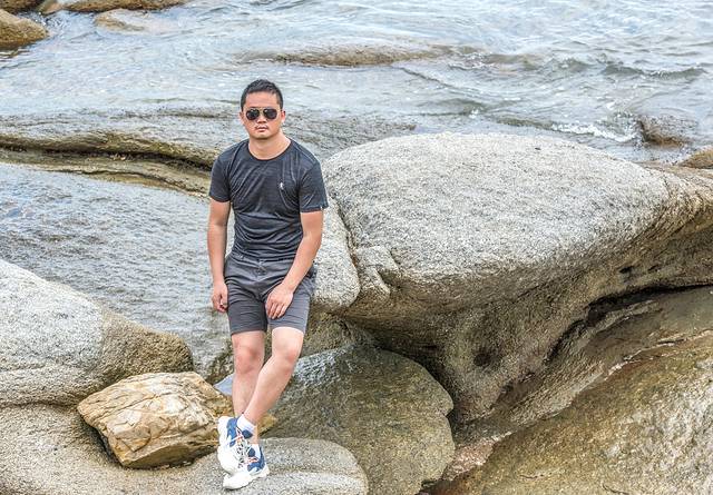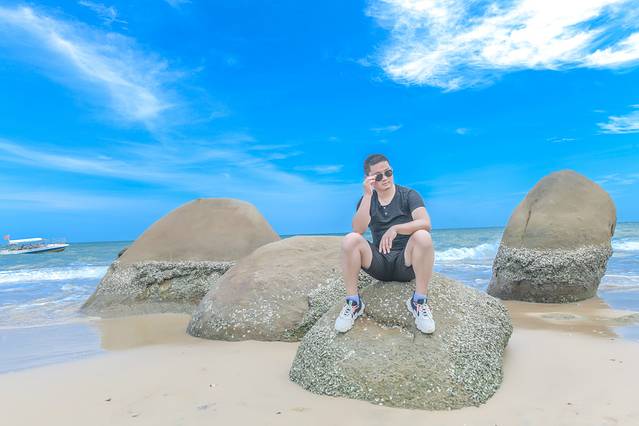 大小洞天海滩最有特色的就是成块的大石头镶嵌在海滩上,无论是单纯的观景还是打卡,都很非常有感觉。山野君找到一处安全且方便的石头来进行合影拍照。很喜欢这种海天一线的人像照片,有着说不出的浪漫温馨的氛围,你们觉得呢?