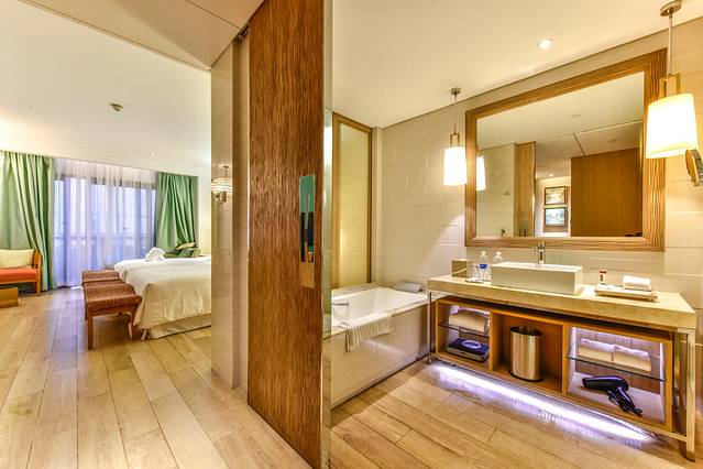 公共区域方面也很值得去点评,它除一般五星级酒店应有的硬件设施外,还拥有属于自己的私人沙滩、蜈支洲码头诸多个私人泳池以及沙滩烧烤吧,整体规模颇为大气。你们喜欢不啦?