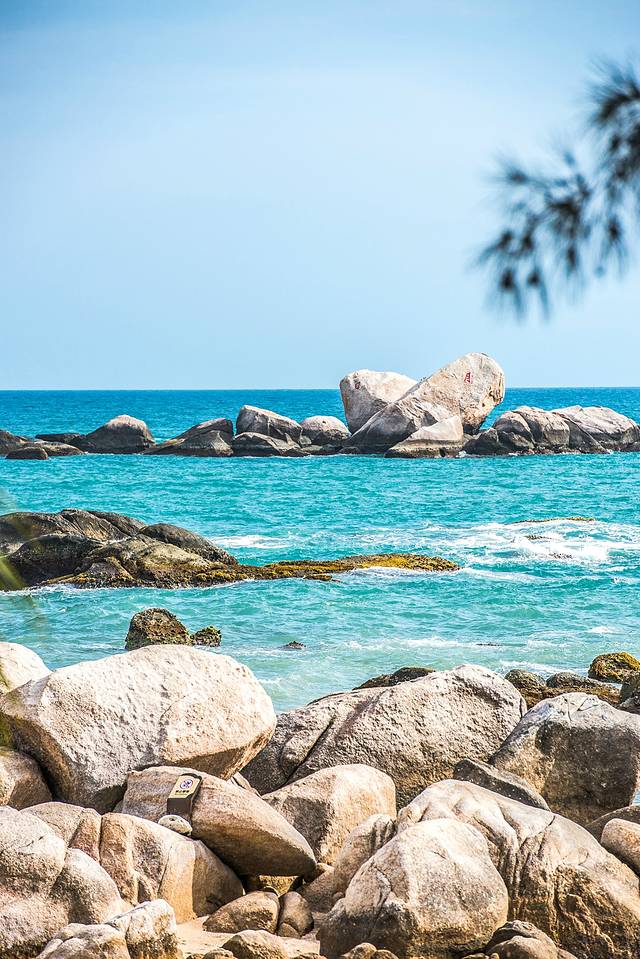距离海滩几海里处的石头与近处的石块形成了漂亮的画面,天涯海角的风光确实很美,超乎山野君的想象。第一次来三亚有听说这个景区,但是很多网友说不太值得来看,所以就放弃了。这一次刚好是自驾游且有赠送的门票,就带着随便看看的心态过来看,没想到这么美。