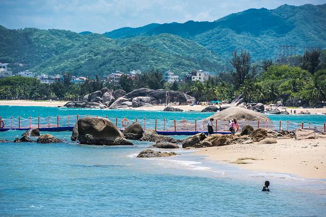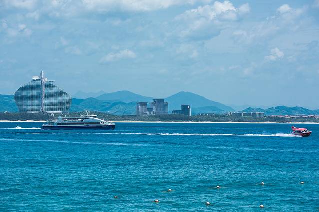 在情人桥观景里面通过长焦镜头来拍照的话,可以拍到海面上来来去去的船只,还有很多潜水设备漂浮其上。远方的海岸上都是海棠湾旅游度假区的一些配套设施,各种度假酒店与餐厅清晰可见。