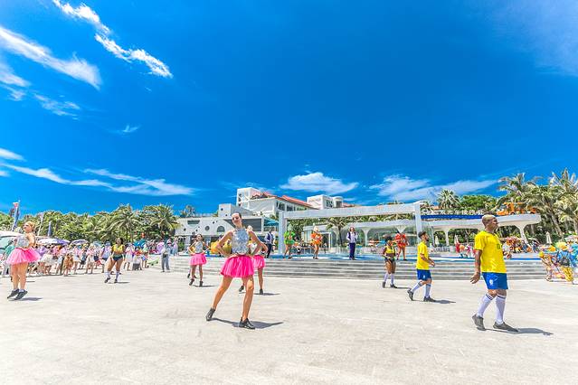 从夏季码头上岛后即可抵达一个广场,这就是山野君要跟大家分享的珊瑚广场。因靠近珊瑚度假酒店而得名为珊瑚广场,相当于蜈支洲岛客流枢纽的功能,所以这里是全岛最热闹的地方,同时经常会有一些大型的户外表演,非常有意思。这个广场除了枢纽功能之外,还坐拥绝佳的观景角度,算得上是三亚市最美广场。